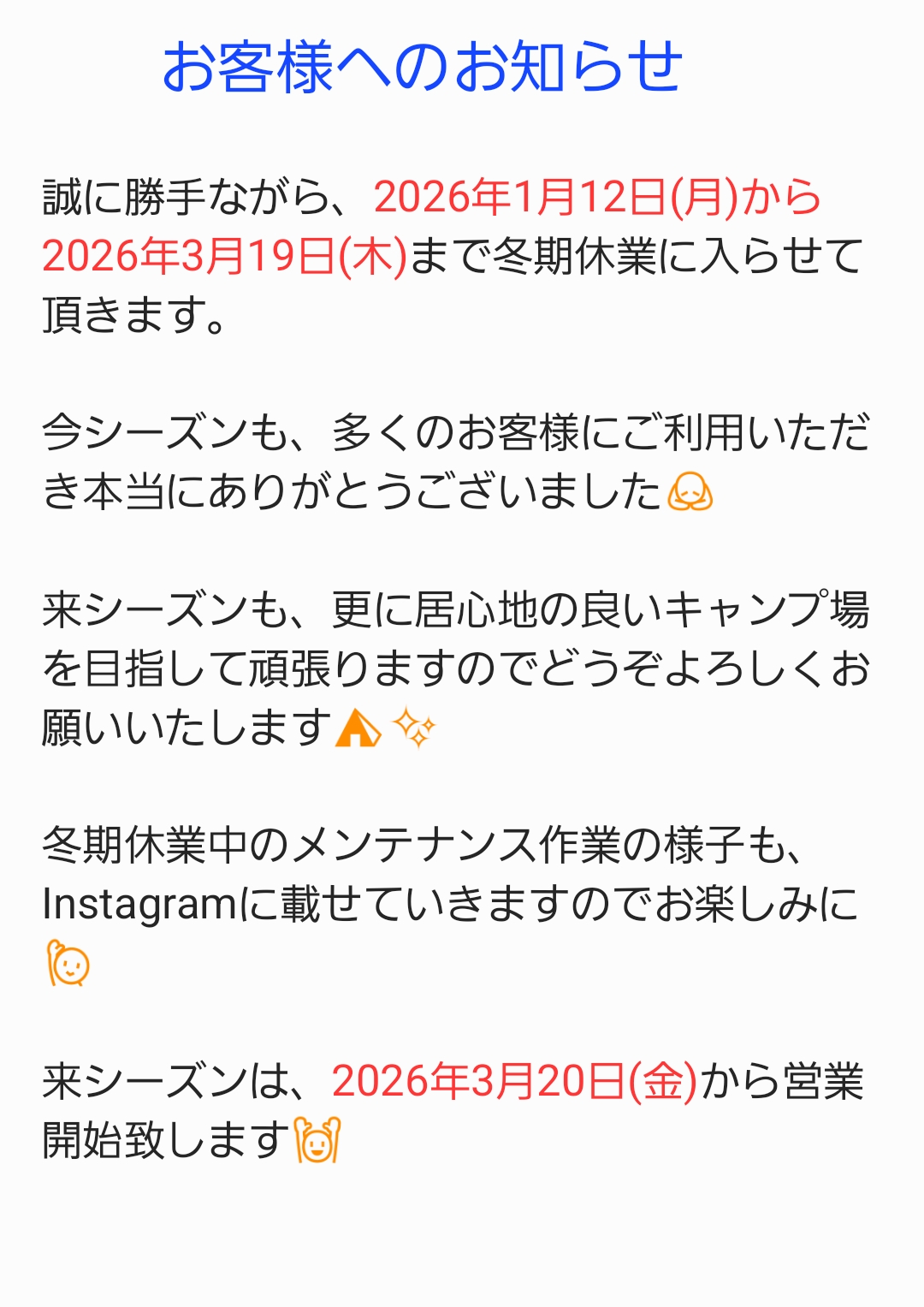 冬期メンテナンス休業